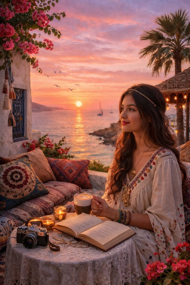 This may contain: a greeting card with flowers and the sun setting on the beach in the back ground